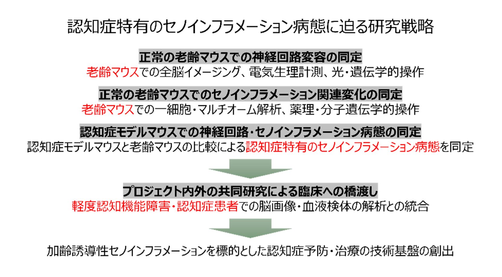 並行して、アミロイドβ変異体やタウ変異体を有する認知症モデルマウスでも同様の解析を行い、正常な脳機能老化と認知症に特異的な加齢誘導性病態の違いを明確化します。これにより、認知症に特有な加齢誘導性のセノインフラメーション病態を抽出します。さらにプロジェクト内外の研究者との共同研究を通じて、軽度認知機能障害・認知症での脳画像研究、血液検体の解析を行うことで、当該病態を標的とした可視化・操作(制御)技術へ展開します。