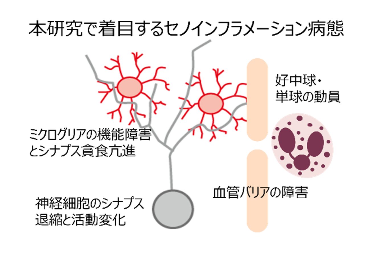 これまで古屋敷らは、慢性ストレスがミクログリアや骨髄由来細胞を起点とする脳・末梢の炎症を介して、神経回路の機能・形態的再編を引き起こし、抑うつや認知機能障害につながることを示してきました。老化に伴い、脳や末梢で炎症関連分子や細胞老化マーカーが増加することが知られていることから、細胞老化と炎症が相互に増幅する状態としてのセノインフラメーションが、老化や認知症に伴う抑うつ・認知機能障害にも関与する可能性があります。一方で、その役割は十分に分かっていません。